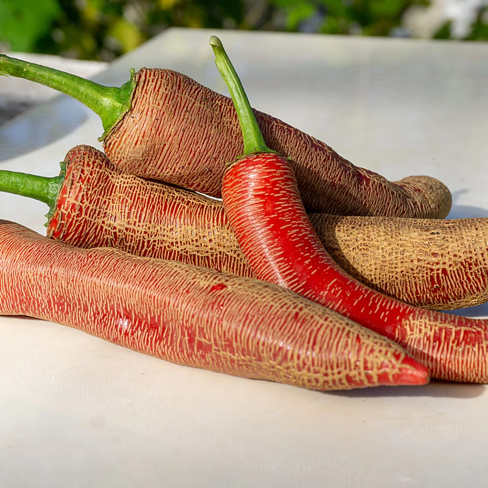 Ein lustiger Chili, der ein feines Korkgewebe auf der Außenhaut trägt, die an Elefantenhaut erinnert. Daher heißt dieser leckere Chili hierzulande Elephant. Er hätte wegen seiner Maserung auch gut Ringelstrumpf heißen können. Im englischen Sprachraum heißt er auch manchmal Embroidered Pepper, also bestickter Pfeffer.