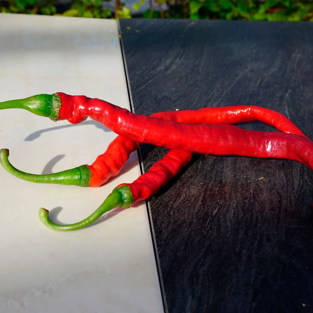 Die scharfen Früchte gehören zu den längsten Chilis und werden bis zu 30 cm lang. Vom Aussehen und Schärfe der Cayenne recht ähnlich, ist auch die Verwendung in der Küche vergleichbar. In erster Linie wird Joe’s Long getrocknet und zu Pulver gemahlen. Diese Sorte kommt aus Italien und ist dort sehr populär. Die Pflanze erreicht eine Höhe von etwa einem Meter.