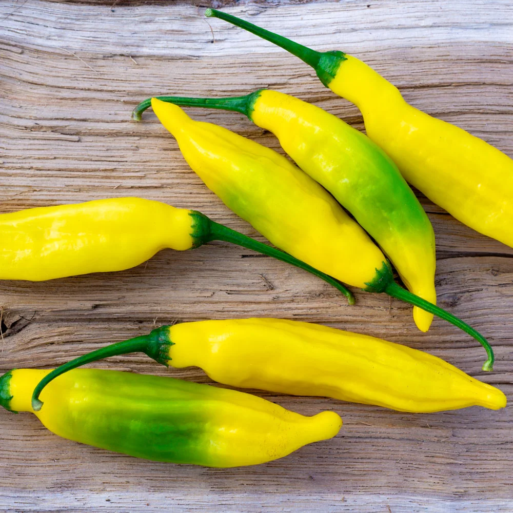 Die leuchtend gelben Früchte werden etwa 6 lang. Die dekorative Pflanze ist recht produktiv, erreicht eine Höhe von einem Meter und wächst schirmförmig.