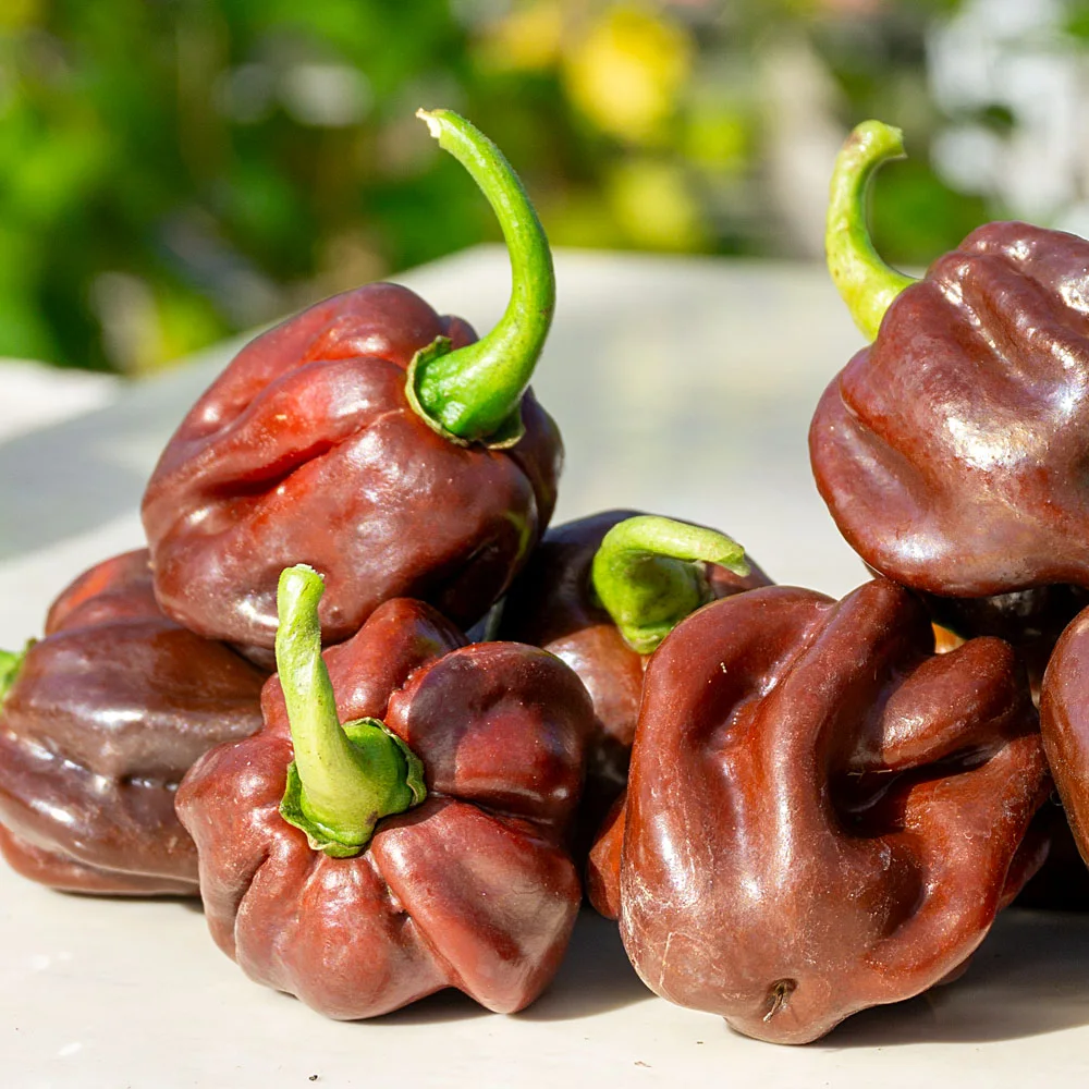 ‘Guadaloupe’ ist ein sehr scharfer Scotch Bonnet von schokoladenbrauner Farbe und nichts für Weicheier.