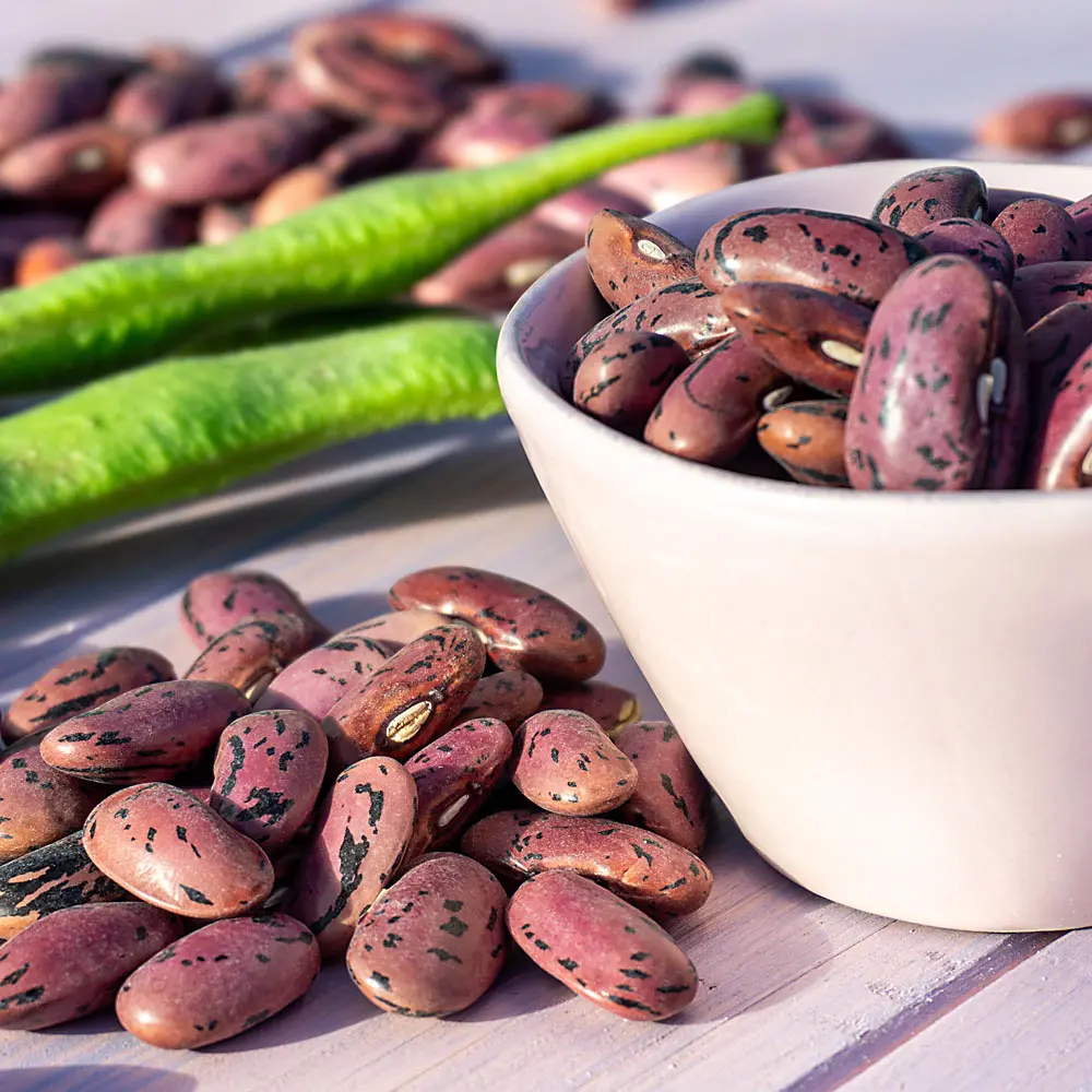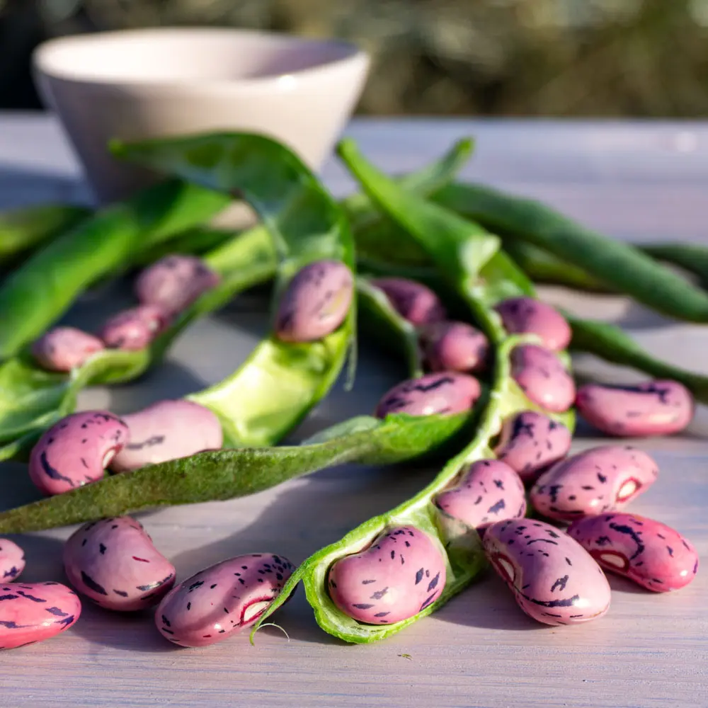 Käferbohnen bilden grüne Hülsen, die etwa 15 cm lang sind. Auch diese können wie Grüne Bohnen zubereitet werden. Die rosa-lila Kerne mit den typischen schwarzen Sprenkelungen sind ab Ende September erntereif. In jeder Hülse befinden sich etwa 4-6 Kerne. Wie alle Bohnen so sind auch diese einjährig.
