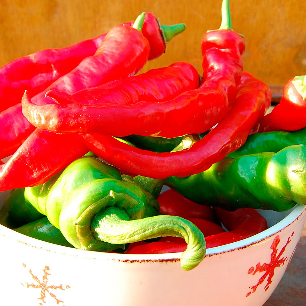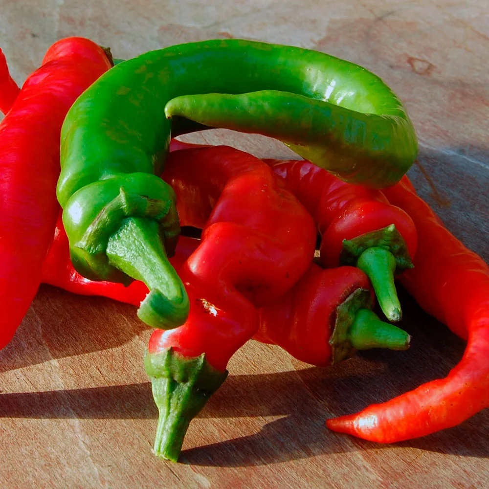 Die etwa 15-20 cm langen Früchte reifen von grün nach rot ab. Sie sind in beiden Reifestadien sehr lecker und können für Pfannengemüse oder Eintöpfe einfach in Ringe geschnitten werden, da sie recht wenig Kerne enthalten. Die Früchte schmecken süßlich-würzig und sind auch frisch in Salaten lecker.