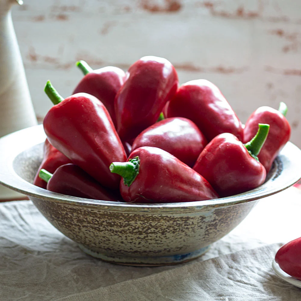 Die Pflanzen erreichen im Topf eine Höhe von 100 cm, ausgepflanzt werden sie etwas höher. Die Früchte stehen spitz noch oben. Die Pflanze ist sehr dekorativ. Sie sind das ideale Naschgemüse. Aber auch gebraten oder gegrillt, sparsam gewürzt, um ihr Aroma zu erhalten.