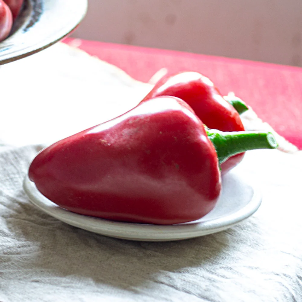 Die roten Früchte werden etwa 7 cm lang. Sie reifen von grün nach dunkelrot. Sie haben einen außergewöhnlichen Geschmack. Würzig, fast salzig, aber auch süß.