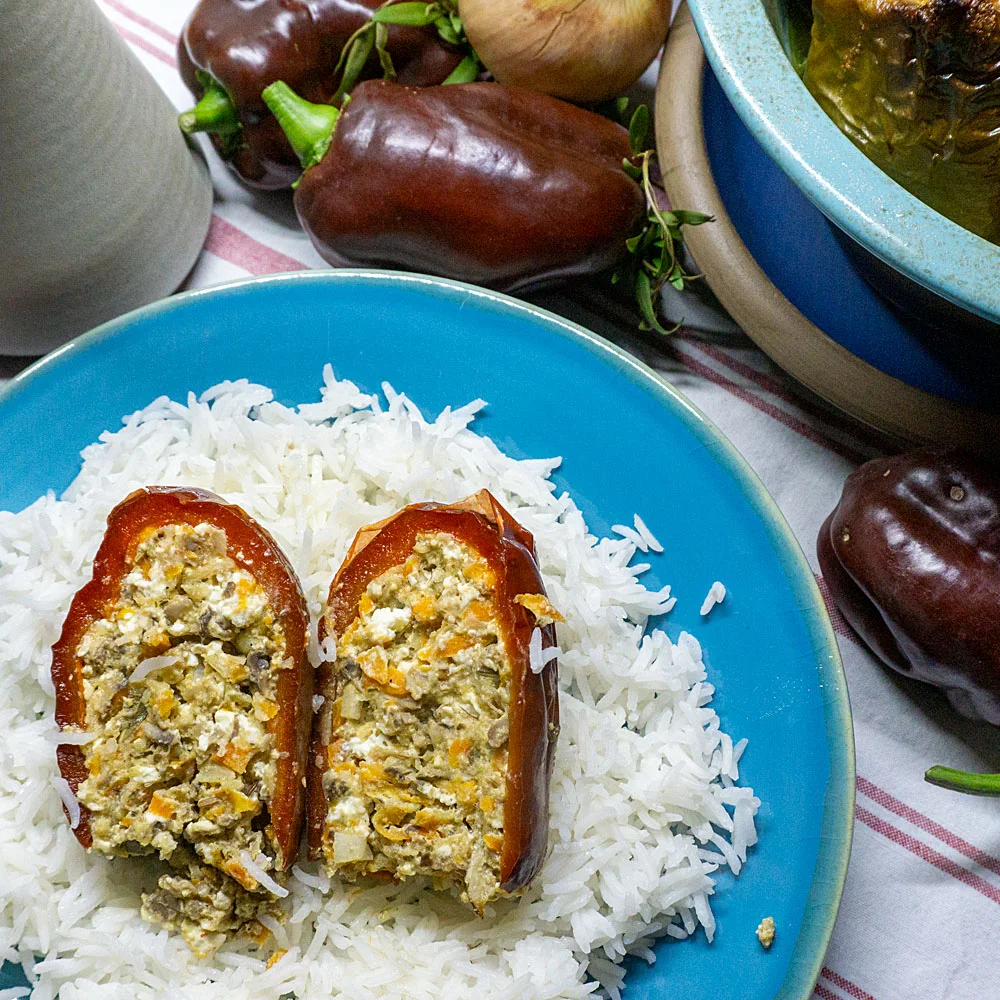 Die Paprikaschoten waschen und den Deckel abschneiden, von den Kernen befreien. Die Füllung auf die Schoten gleichmäßig verteilen und die Schoten in die feuerfeste Form setzten. Im vorgeheitzen Backofen bei 200°C 45 Minuten backen. Dazu Reis.