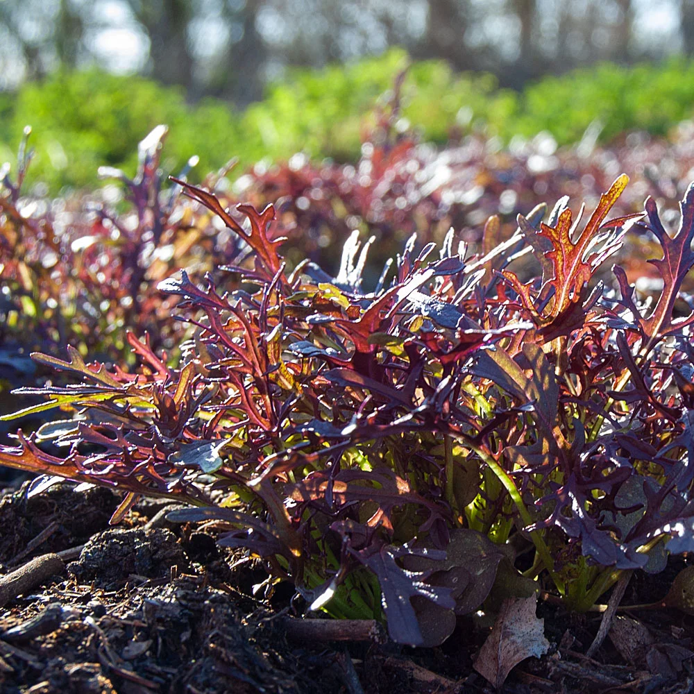 ‘Red Frills’ ist ein würziger, senfig scharfer Salat mit filigranen, dekorativen Blättern – er kann allein oder in Kombination mit anderen Salaten verwendet werden kann.