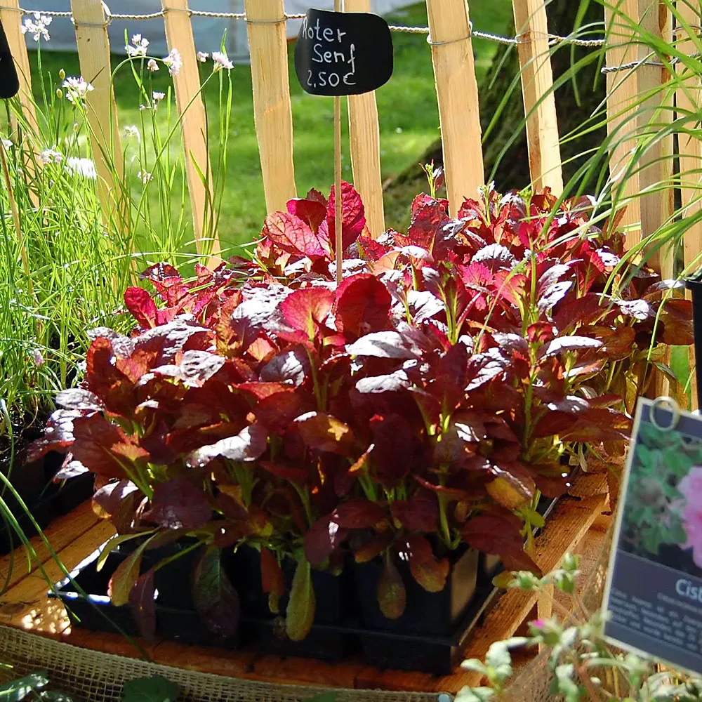 Dunkelrote, glatte Blätter mit scharf-würzigem Senfaroma zeichnen diesen Blattsalat aus.