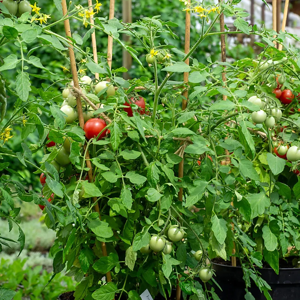 Eine Ampel- und Balkontomate, die eine Höhe von etwa 50 cm erreicht.