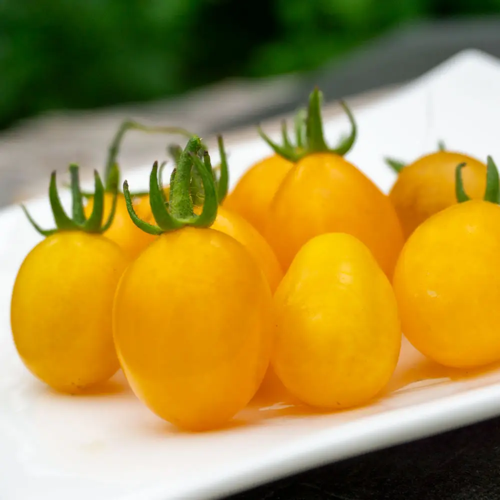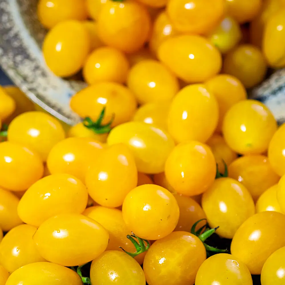 Die gelbe Datteltomate entwickelt bis zu 50 Früchte an jeder Traube, die fast zeitgleich reifen. Die tropfenförmigen Früchte sind sattgelb und können lange gelagert werden.
