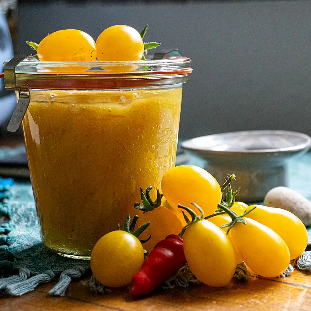Gelbe Datteltomaten sind recht saftig und ergeben eine leckere Suppe. Die Kombination mit Apfel und mit Ingwer gewürzten Sojabohnen ist eine wärmende herbstliche Variante.