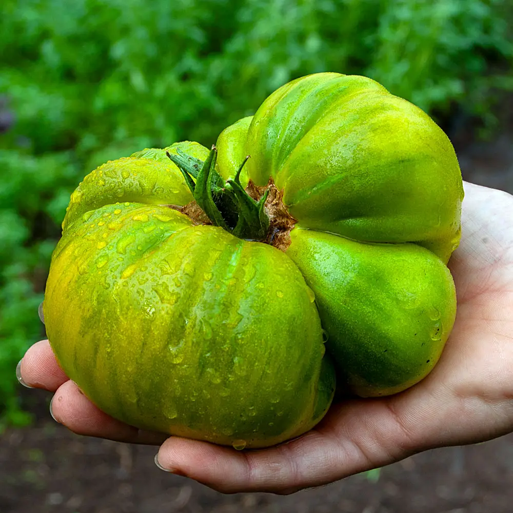 Die Früchte von ‘Green Velvet’ erreichen ein Gewicht von 400 gramm. Sie sind sehr saftig, im Aroma etwas mehlig und für grüne Tomatensuppen gut geeignet.