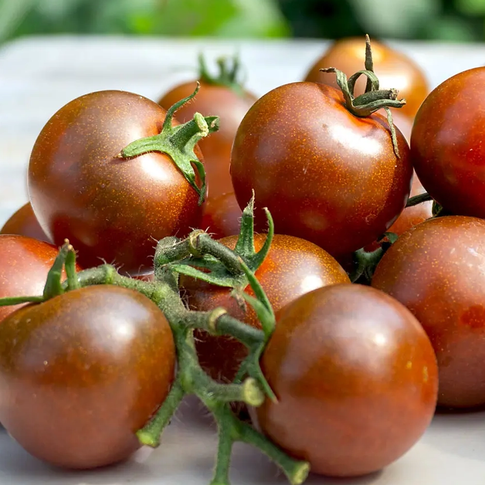 Geschmacklich sind die Früchte ähnlich wie Black Cherry, aber mit einem Durchmesser von 3 cm deutlich kleiner. Eine ideale Naschtomate, passt aber auch in Salate oder auf eine Quiche.