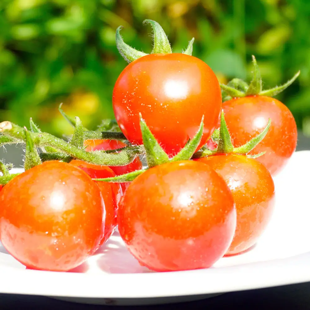 ‘Resi’ ist die klassische Kirschtomate. Sie reift ab Ende Juli und ist ideal zum Naschen. Die leckeren Früchte sitzen zu 10 Stück an den Rispen und reifen nacheinander ab.