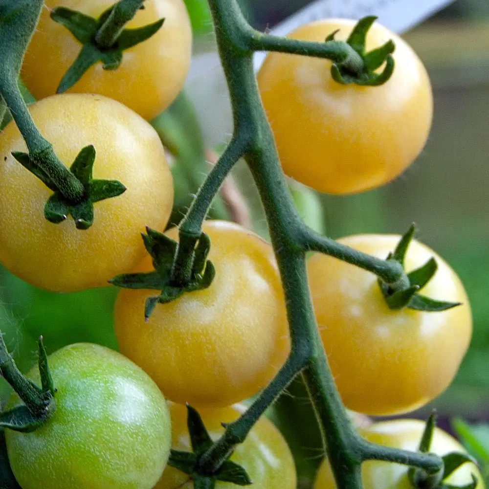 ‘Weißleinchen’ ist eine sehr aromatische Kirschtomate von vanillegelber Farbe. Sie ist absolut platzfest. Bereits ab Mitte Juli reifen die ersten Früchte, die traubenartig an der Pflanze sitzen.