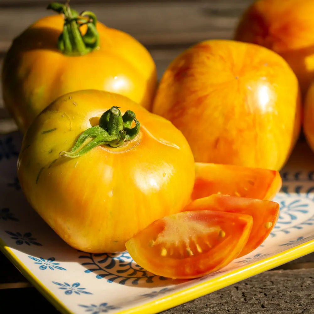 Eine Fleischtomate mit vorzüglichem Aroma. Die Früchte reifen bereits Anfang August und sind gelb-orange-rot geflammt. Das Fruchtfleisch ist ebenfalls mehrfarbig. Die Haut ist dünn und die Früchte haben mehrere Kammern. Die Tomate ist sehr saftig und eignet sich gut zum Rohessen. Die Früchte werden 300 g schwer und haben einen Durchmesser von etwa 10 cm.