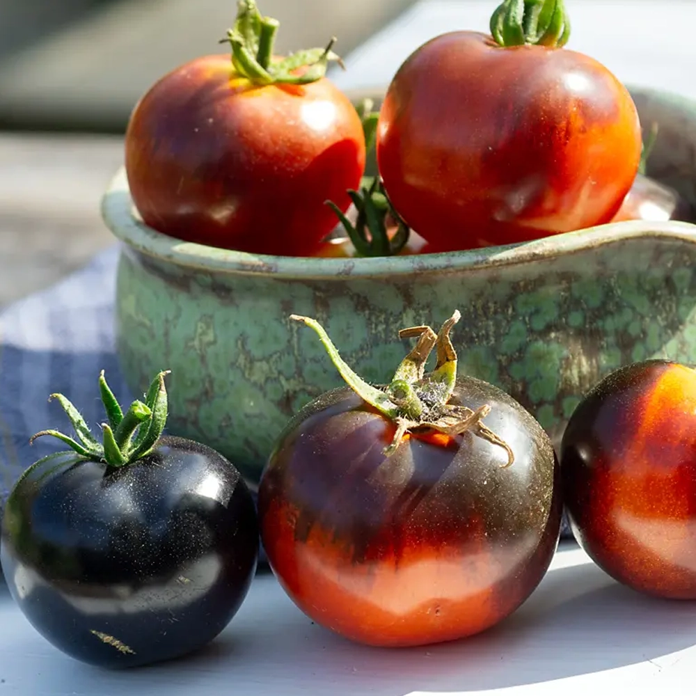 Indigo Rose ist eine Stabtomate mit wenig Geiztrieben, wächst kompakt und erreicht eine Höhe von 80 cm. Es kann bis Ende September geerntet werden.