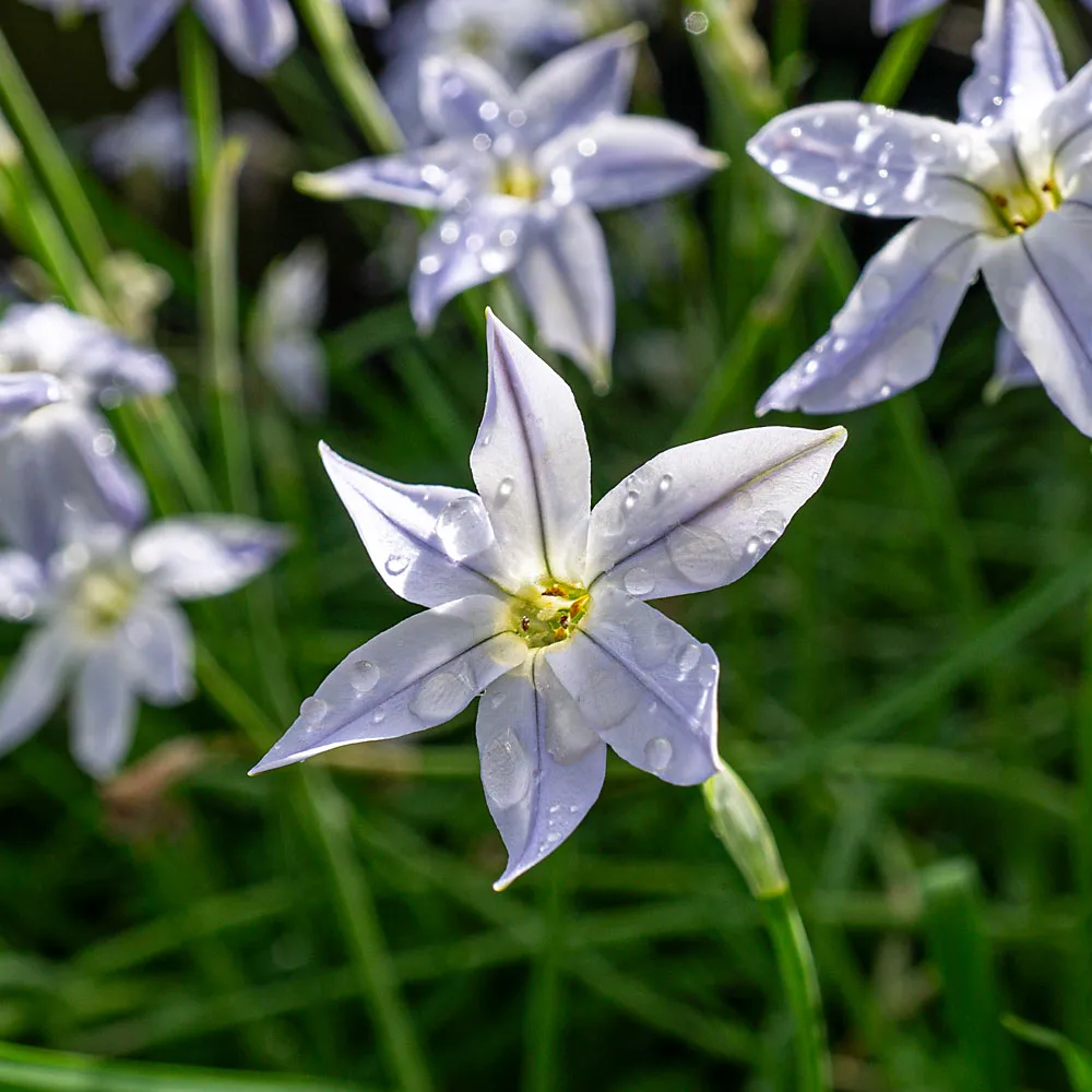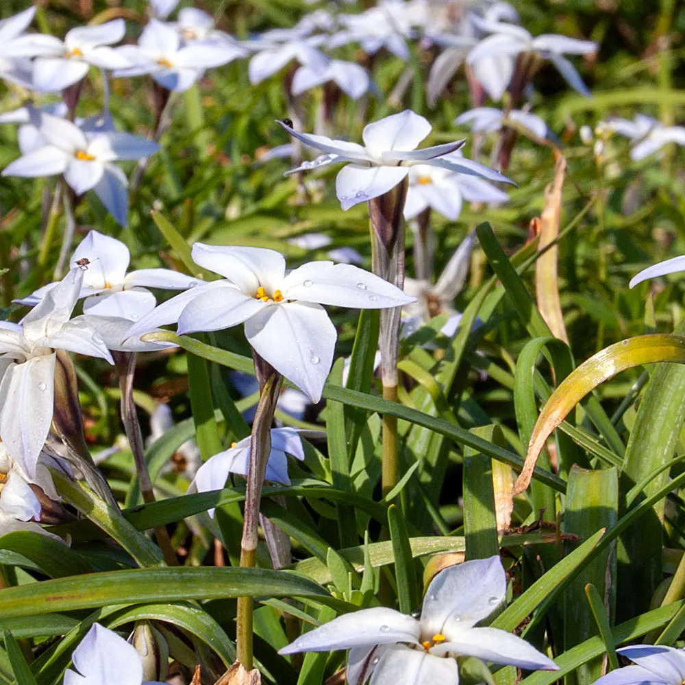 Die kleinen blassvioletten sternförmigen Blüten treiben bereits ab März. Der Frühlingsstern ist eine kulinarisch verwendbare Staude aus Urugay und Argentinien. Sie ist auch bei uns winterhart und treibt zuverlässig jeden Frühling wieder aus.