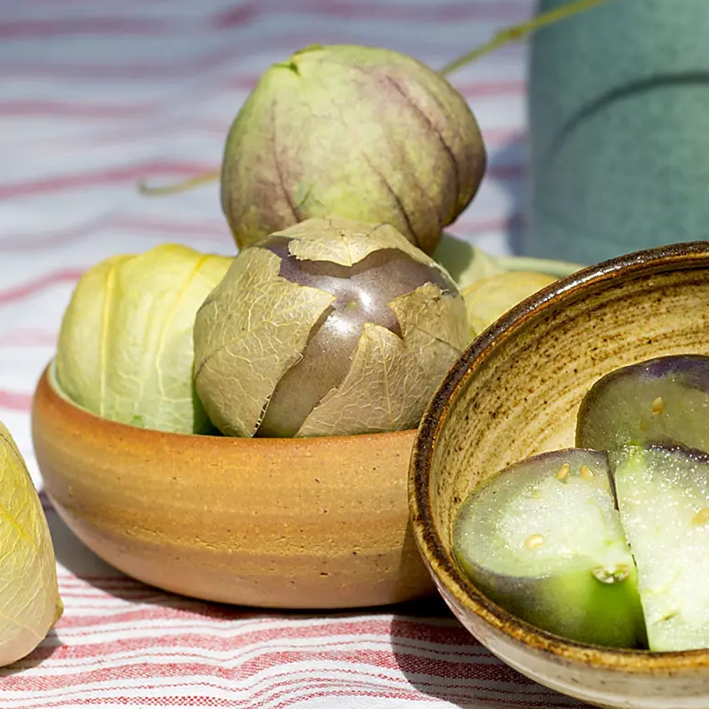 Die Früchte der Tomatillo Purple sind sehr erfrischend. Sie haben einen süßlich-säuerlichen Geschmack und schmecken wie eine Mischung aus Tomaten und Andenbeere.