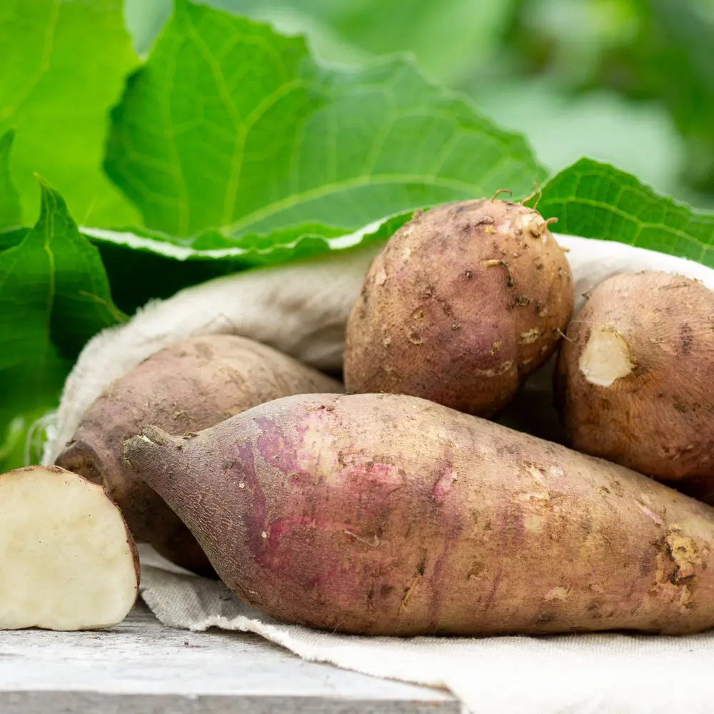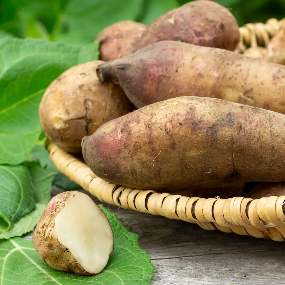 Die Pflanze produziert im Laufe des Sommers etwa 20 längliche Knollen von der Größe einer Süßkartoffel.