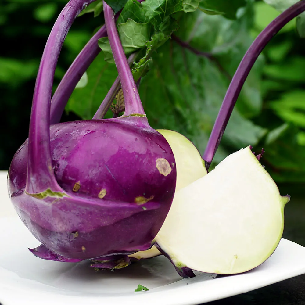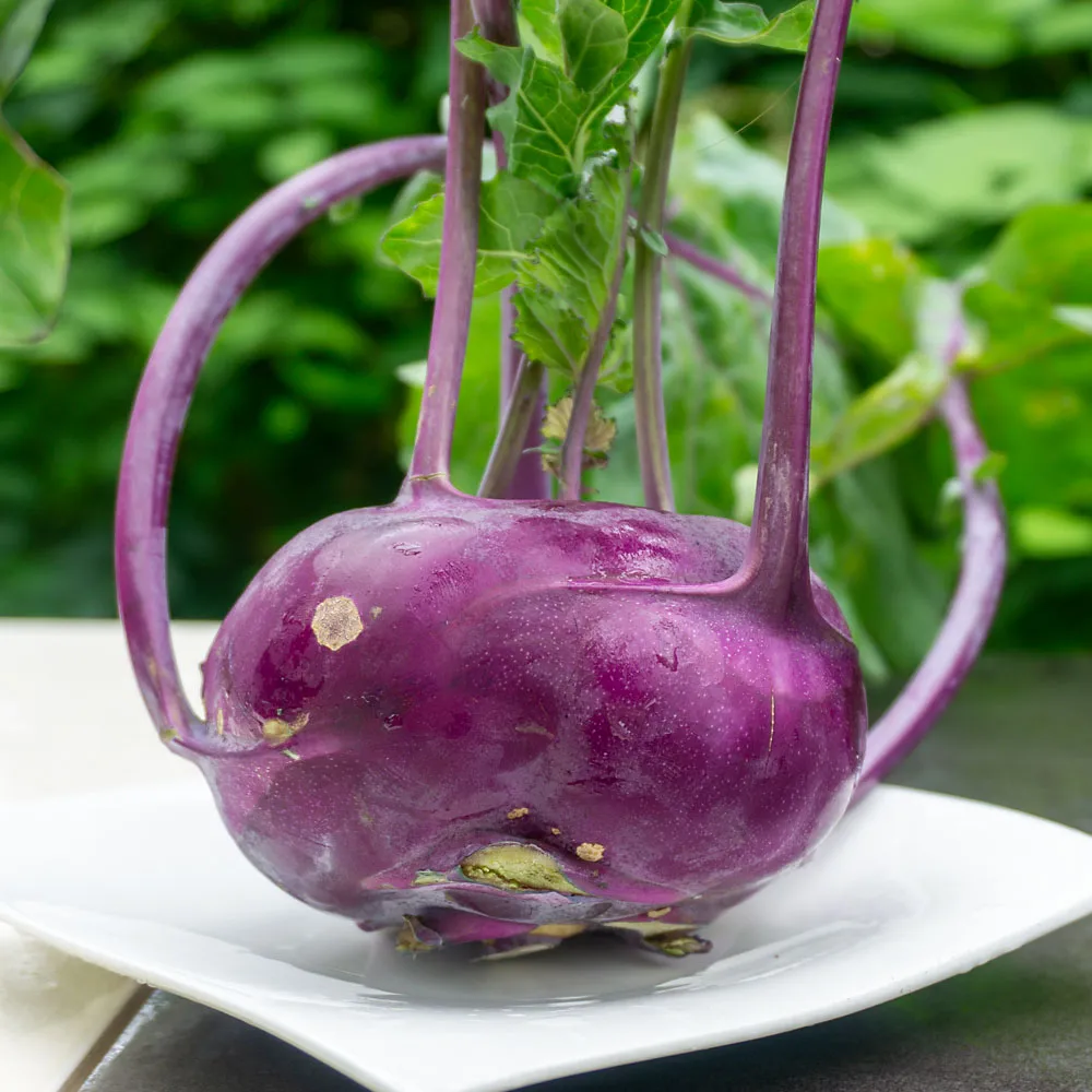 ‘Azur Star’ ist ein blau-violetter Kohlrabi mit einem feinen süßlichen Geschmack. Er ist eine frühe Sorte mit filigranem Laub.