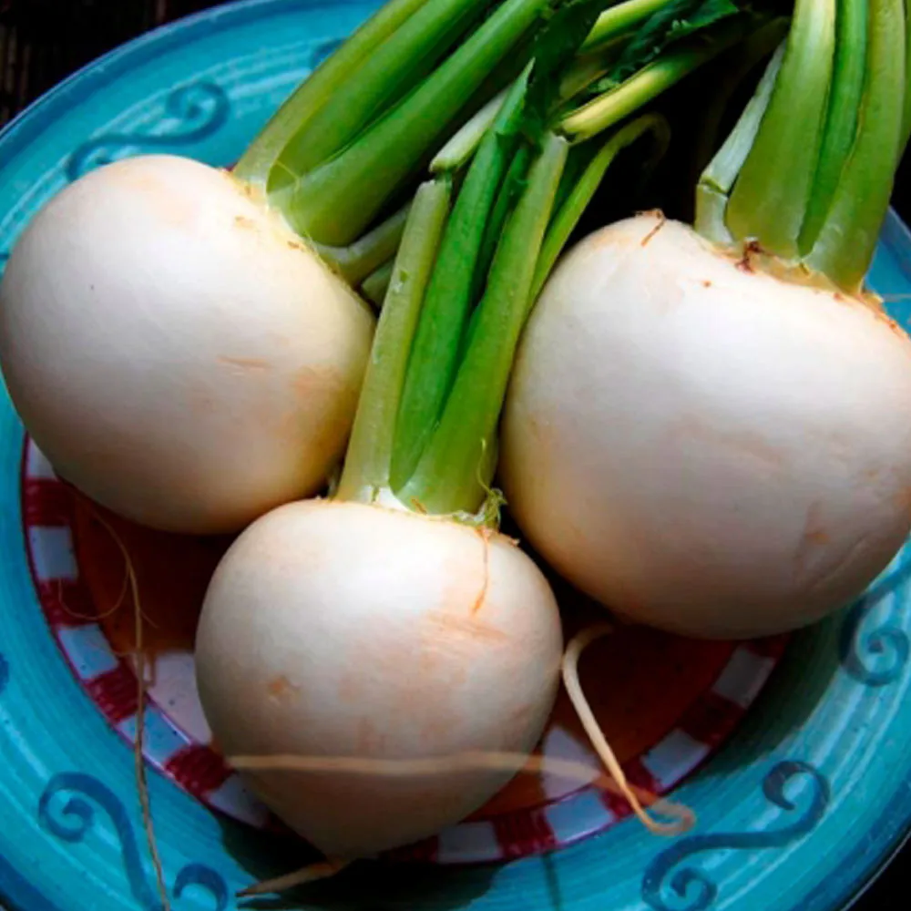 Ein delikates Mairübchen von cremeweißer Farbe. ‘Snowball’ erreicht eine Größe von 6 cm im Durchmesser und kann auch als Herbstrübchen angebaut werden.