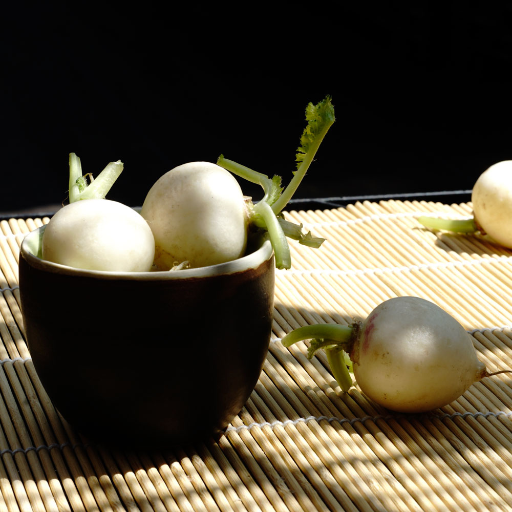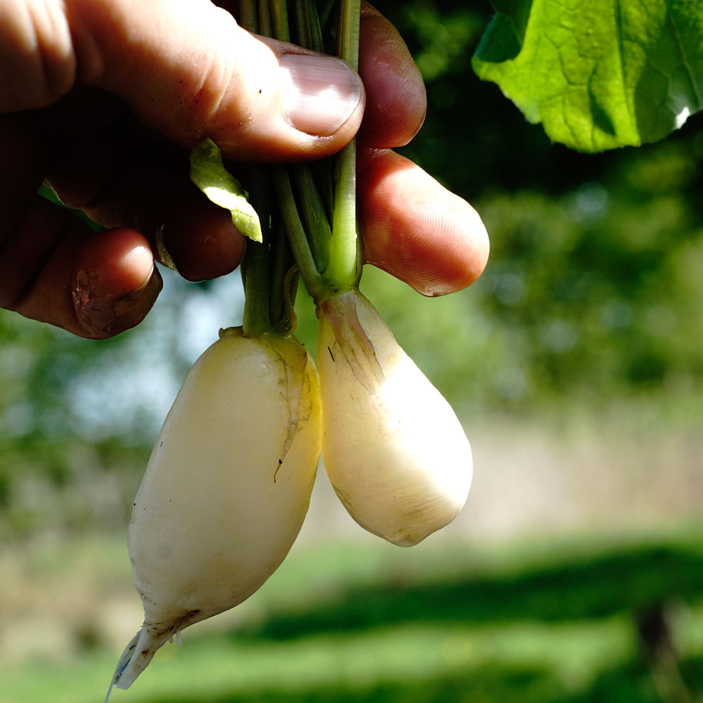 Die runden Knollen eignen sich gut für den Frühjahrsanbau und können bereits an Juni geerntet werden. Ein zweiter Satz kann ab Mitte August ausgesät werden für die Ernte im Herbst.