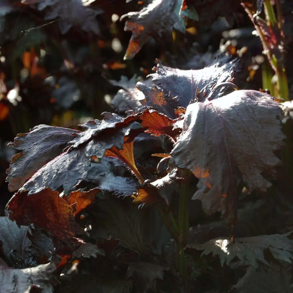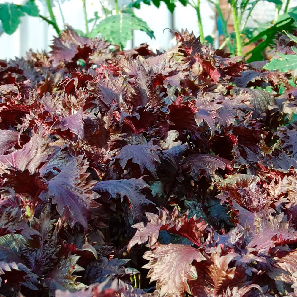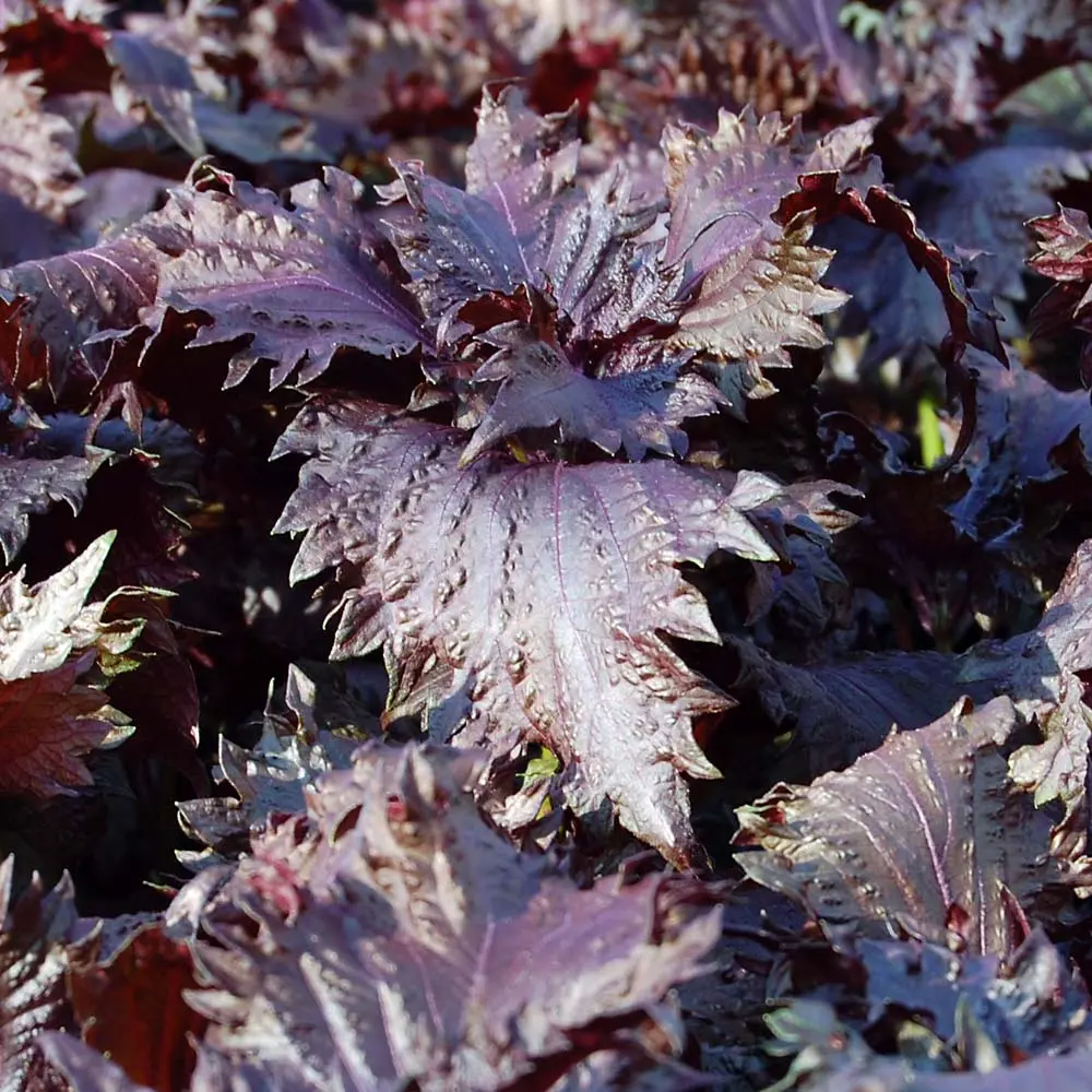 Rote Perilla besticht durch ihre Farbe. Der Geschmack ist erdig, würzig und passt gut zu fruchtigem Gemüse wie Tomaten und Gurken.