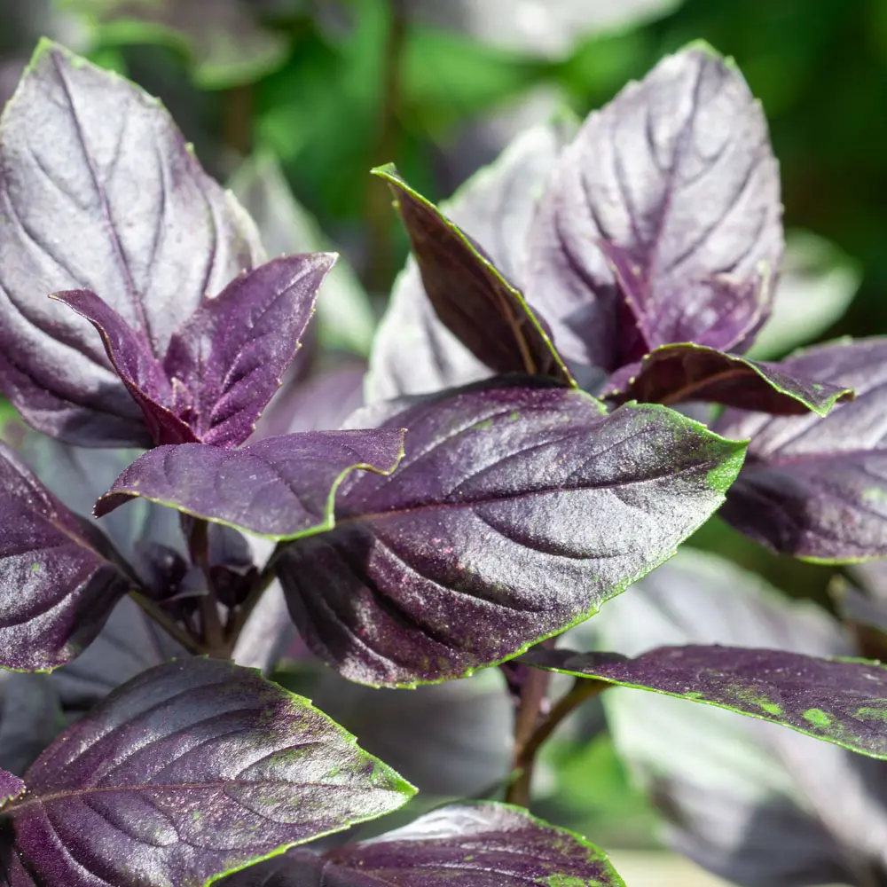 Basilikum ‘Dark Opal’ bildet dunkelrote große glänzende Blätter aus, die sehr würzig schmecken. Sie enthalten eine gute Kombination aus Pfeffer, Anis und Nelken. Sehr lecker für Pestos.