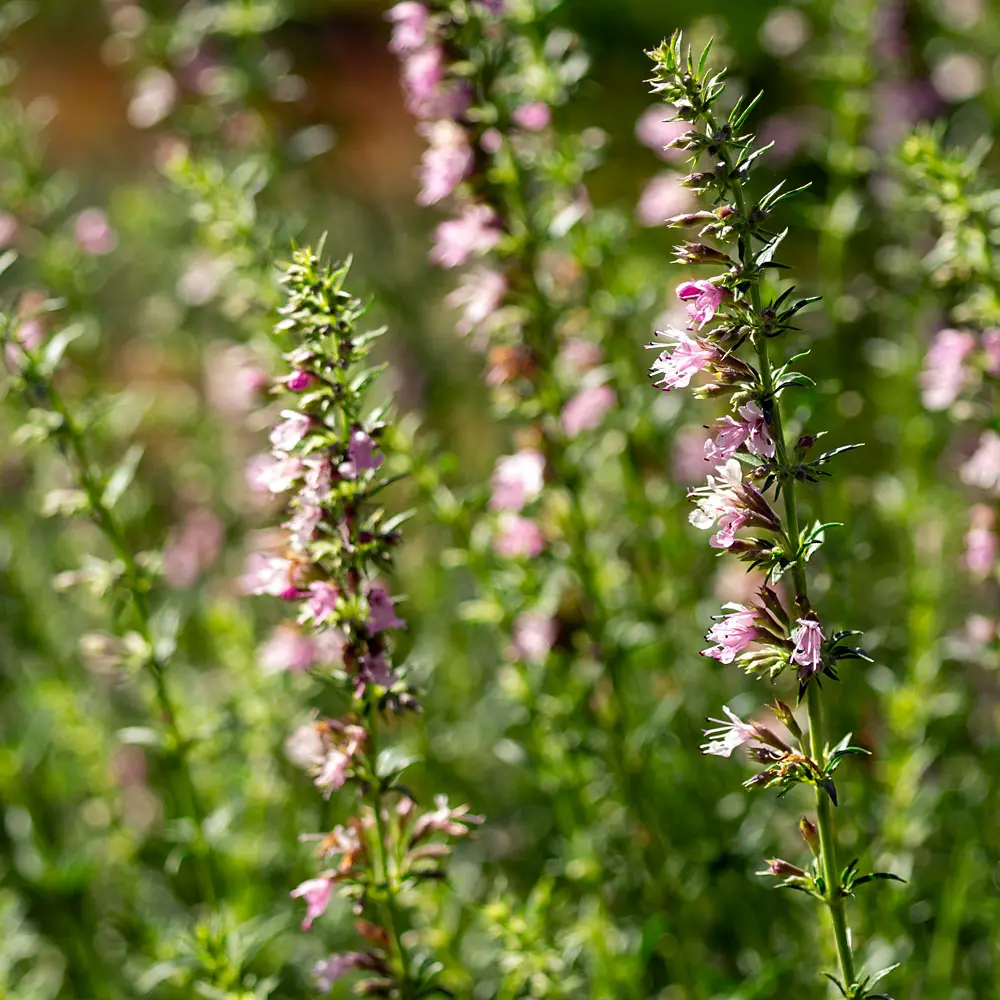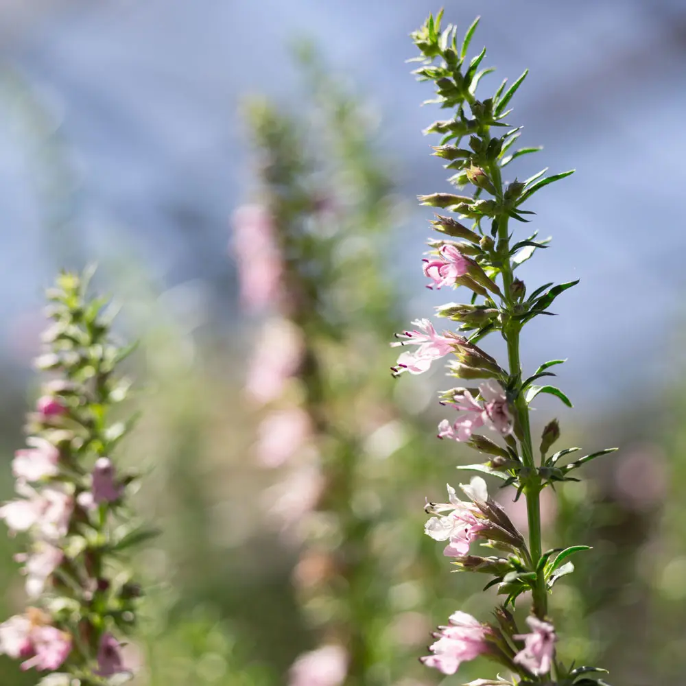 Rosa Ysop ist eine Auslese der ursprünglich blauen Form des Ysop. Geschmacklich eine Mischung aus Thymian, Oregano und Salbei.
