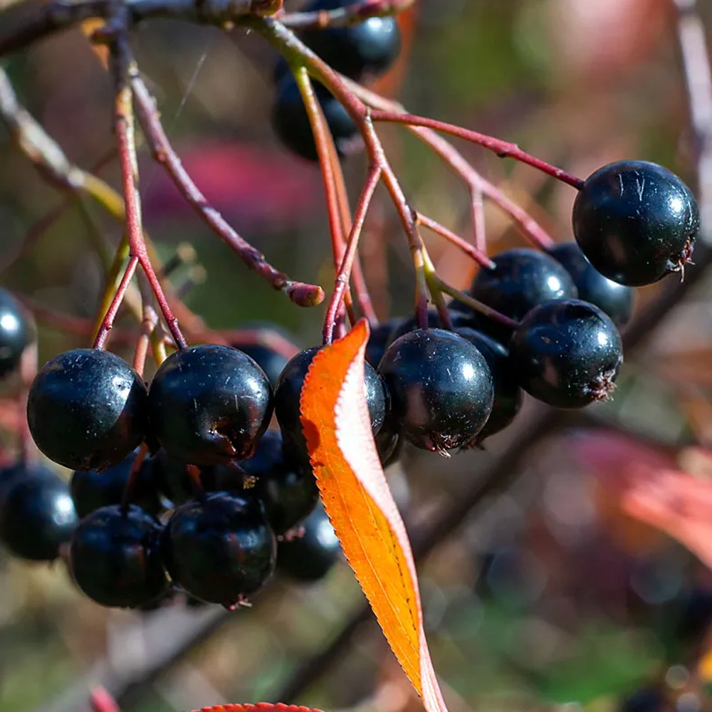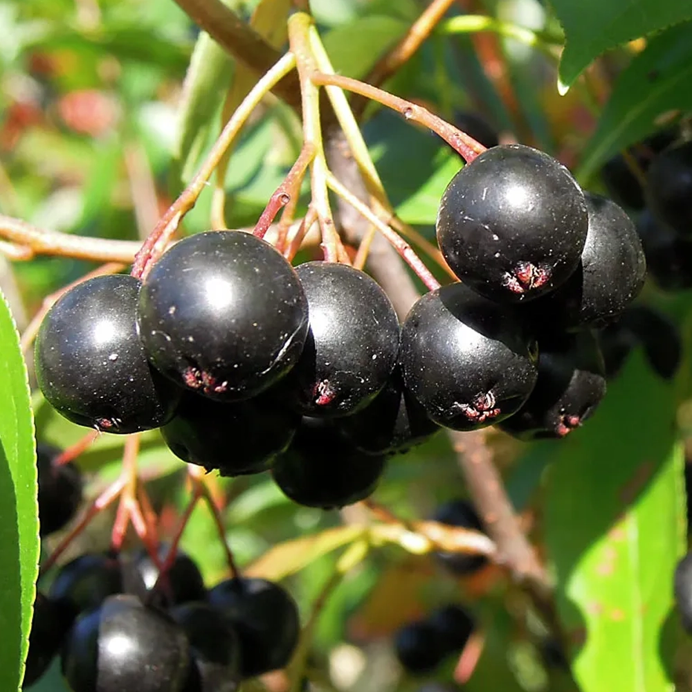 Die Aroniabeere der Sorte ‘Hugin’ ist in Schweden gezüchtet worden. Die Pflanze gilt als sehr winterhart.