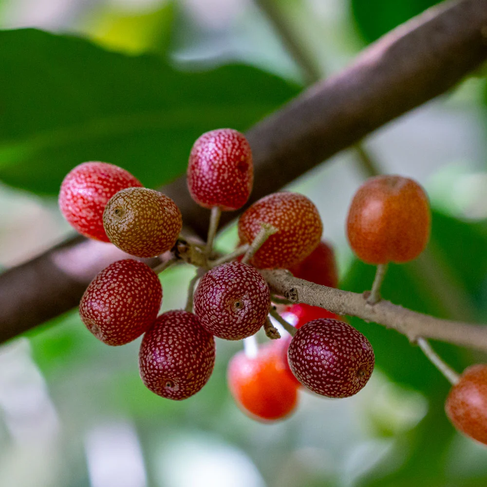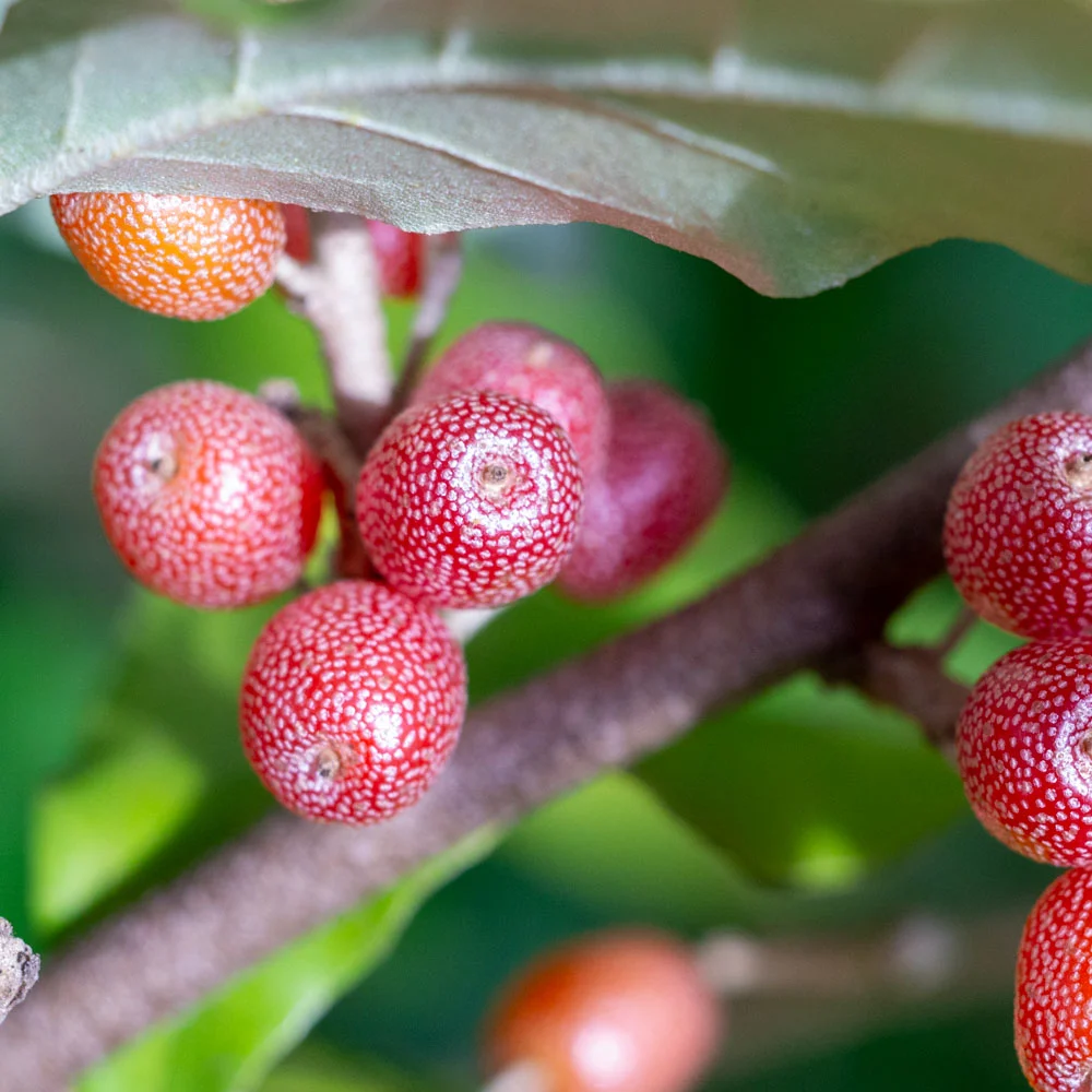 Die essbare Ölweide bildet zahlreiche, wohlschmeckende rote Früchte, die reif direkt vom Baum verzehrt werden können. Sie haben ein fruchtig-säuerliches Aroma.