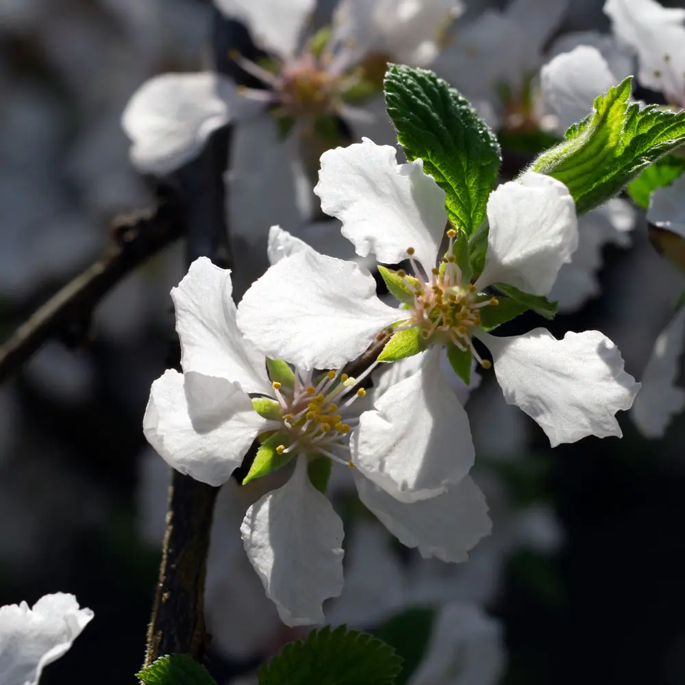 Die weißen duftenden Blüten erscheinen im Mai. Sie werden gerne von Bienen und Schmetterlingen besucht. Die Pflanze ist selbstfruchtbar, aber sie produziert mehr Früchte, wenn eine zweite Pflanze in der Nähe ist.