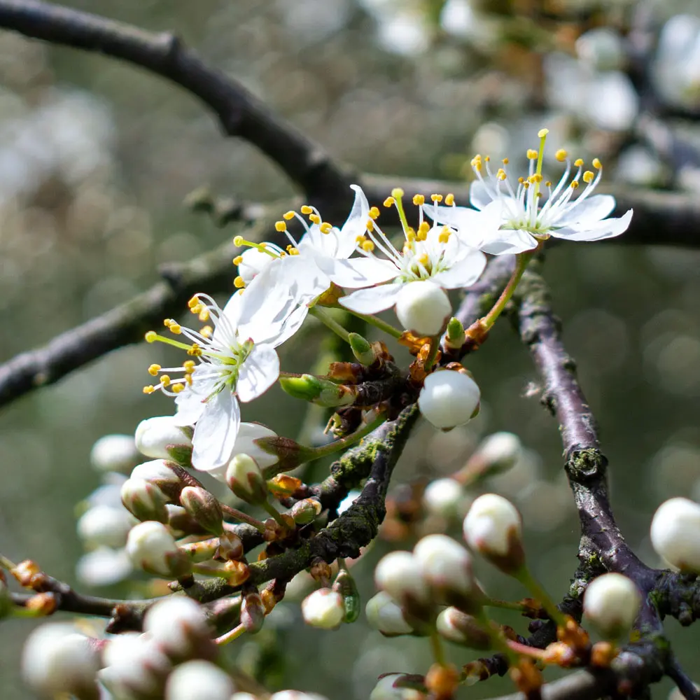 Schlehe oder Schwarzdorn gilt als der Vorläufer der Kulturpflaume. Bei uns ist der Strauch heimisch und wächst an Waldrändern, in Knicks und ist auch auf Freiflächen zu finden. Der etwa 3 Meter hohe Strauch gehört zu den früh blühenden Gehölzen. Die weißen, süßlich duftenden Blüten erscheinen vor dem Blattaustrieb im März und sehen sehr dekorativ an den schwarz berindeten Ästen aus.