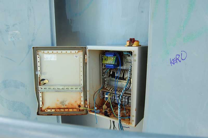 Der Aussichtsturm überragt die Szenerie. Bemerkenswert der Eingang zum Turm. Kostete wohl zu Gartenschau eine Gebühr, hier raufzukraxeln. Dieser Sicherungskasten ist ein Sinnbild für den ganzen Park.