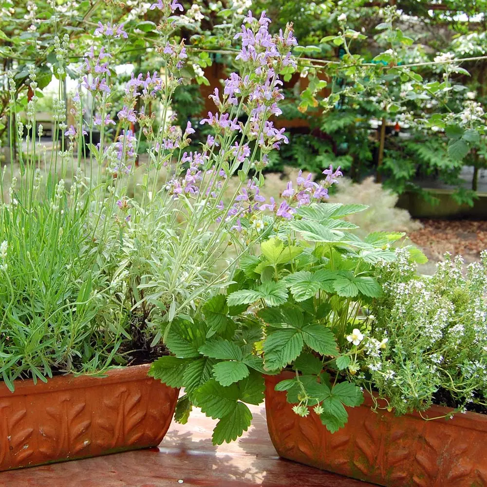 Der Lavendel ‘Little Lady’ erreicht eine Höhe von 30cm. Er blüht reichhaltig mit mittelblauer Blüte im Juni und Juli. Die Mini-Erdbeere ‘Alexandria’ trägt von Juni bis September ihre kleinen süßen Früchte, die zum Naschen einladen. Sie wächst horstig und bleibt dadurch klein und kompakt. Der Zwergsalbei ist ein Heilsalbei in Zwergengröße von 40 cm. Die kleinen aromatischen Blätter eignen sich gut für Tees und sommerliche Tomatensoßen. Zudem bezaubert er mit hellblauen Blüten im Mai.